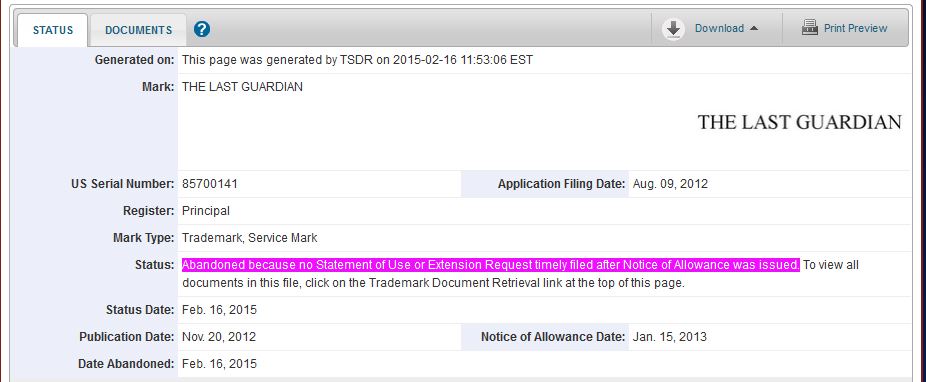 According to the game’s listing on the website of the office of patent and trademark in the US, Sony has not extended its trademark for The Last Guardian.