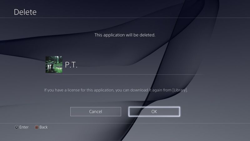 P.T.’s total eradication from PSN is such an unusual move that it actually renders the PS4’s game deletion screen incorrect or, at least, misleading: yes, it says you can re-download the game from your library in the future, but only “if you have a license” for it — and in the case of P.T., Konami just simultaneously revoked that license for every single person on Earth.