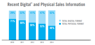 As you can see from the chart below, digital downloads have slowly been gaining as a percentage of overall sales. In 2014, the percentage of sales tipped in favor of digital downloads, and that number is likely to grow.